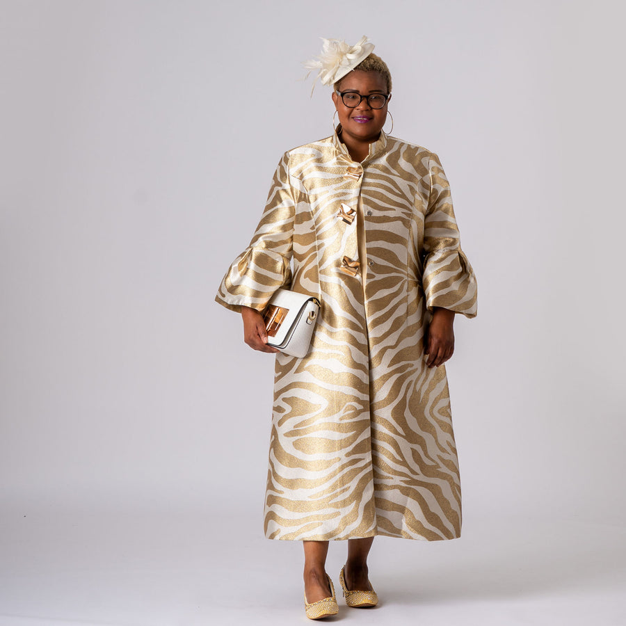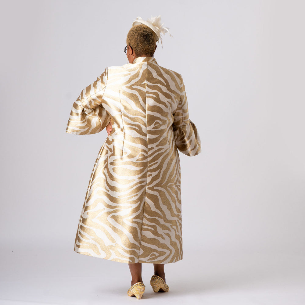 This formal dress and coat set for weddings is all about understated glamour. The midi dress comes in a soft gold with a subtle print at the top, while the long structured jacket features a rich jacquard design in gold and ivory. Bell sleeves and a mandarin-style collar give the outfit a formal feel, perfect for anyone who wants to look polished and graceful for a special day.