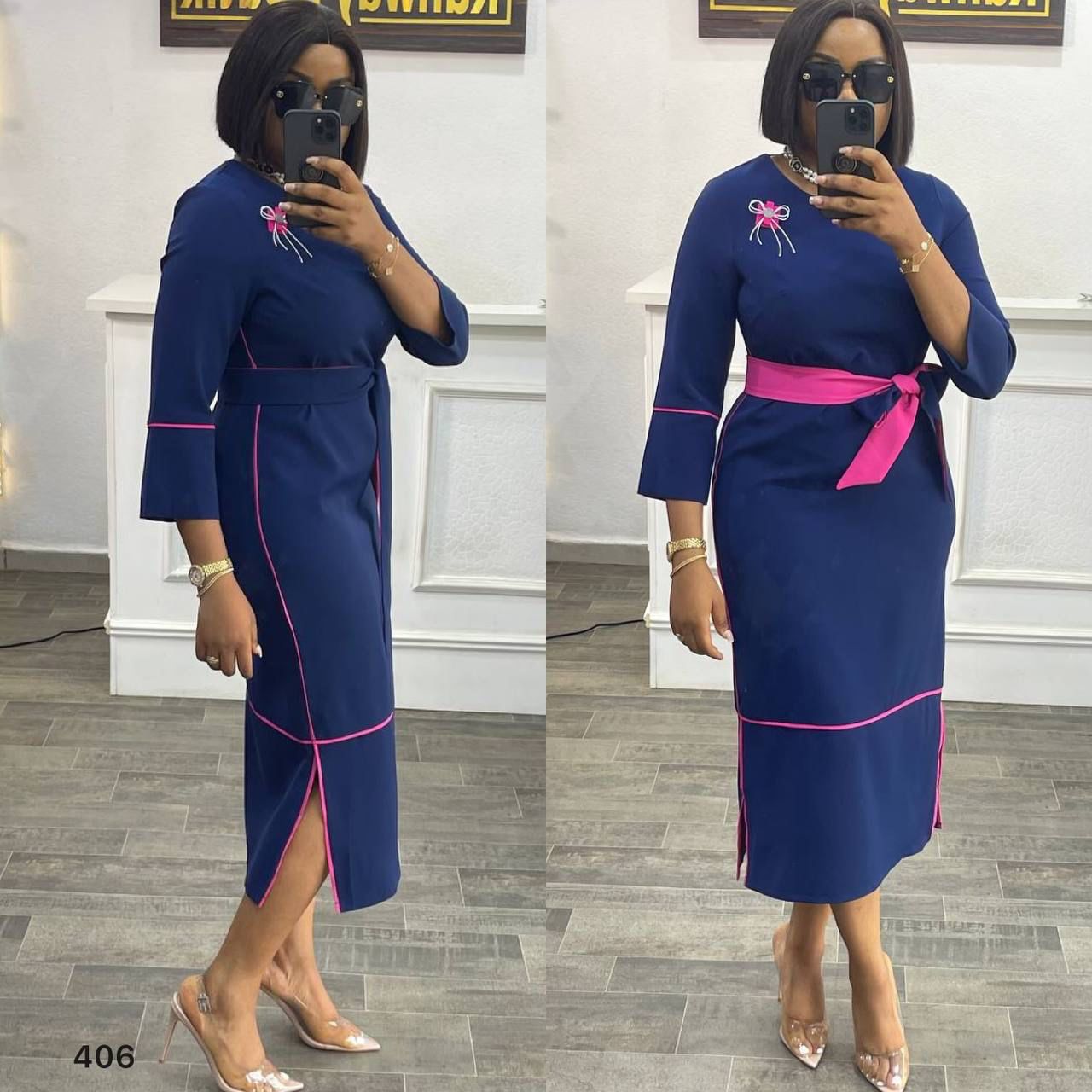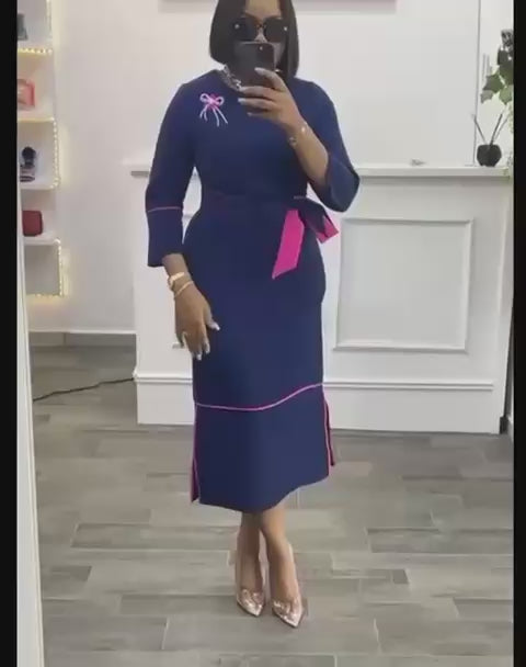This elegant navy shift dress combines timeless tailoring with playful pink accents. Made from soft, breathable polyester, it features a flattering midi cut and a matching fabric belt to enhance your silhouette—perfect for any smart or semi-formal event.