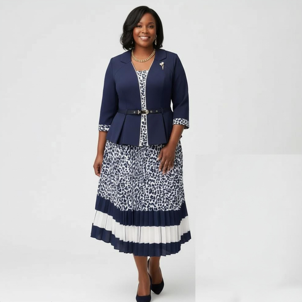 The pleated midi skirt brings the whole look together with alternating vertical bands of leopard print, white, and navy. The pleats add graceful movement and keep the silhouette modest and flattering. This is the perfect outfit for traditional mothers and guests who want something elegant, comfortable, and eye‑catching for church, weddings, or formal daytime events.