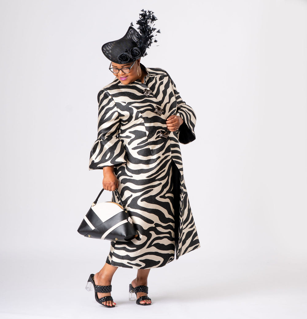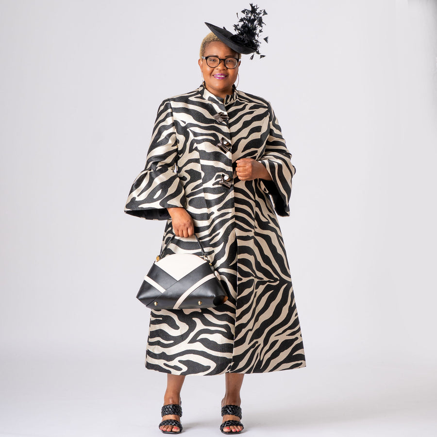 Make a confident entrance in this bold mother of the bride outfit. This two-piece set features a plain black sheath midi dress with a zebra-print detail at the top, and a striking longline jacket in textured black and ivory jacquard. The jacket’s bell sleeves and mandarin collar (Chinese-style collar) add a formal touch, while the pattern keeps it fashionable and eye-catching. Perfect for the woman who wants to make a statement while staying elegant.