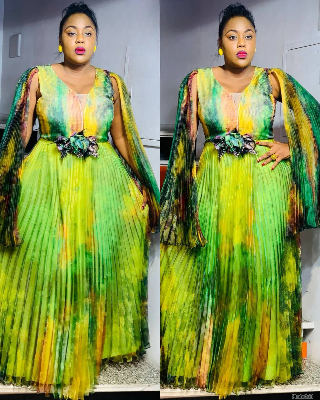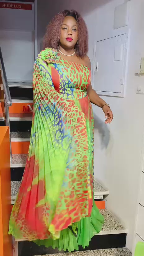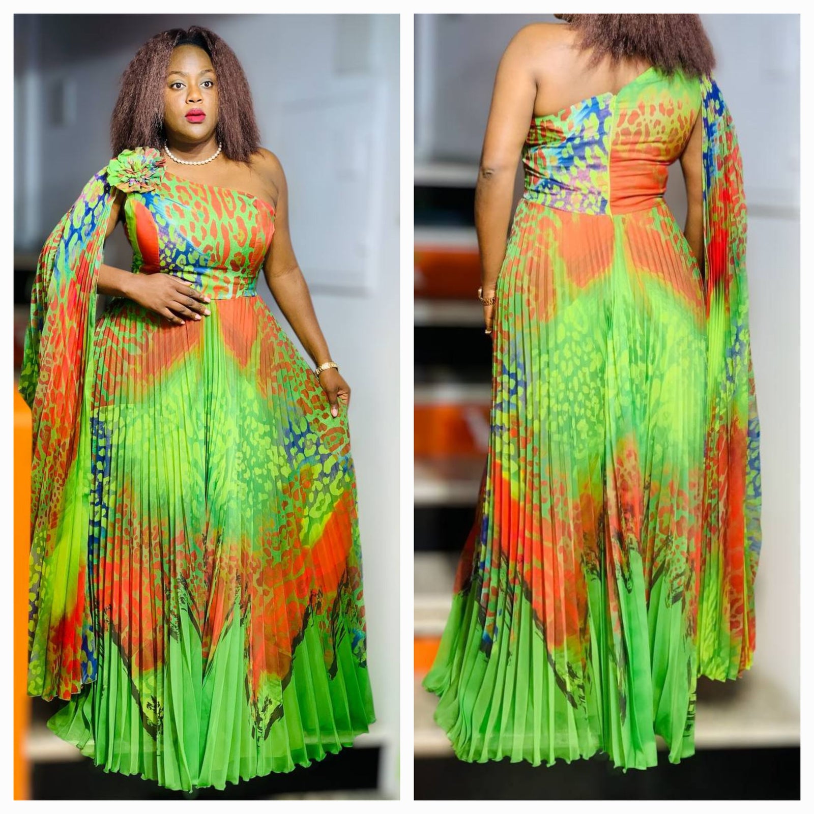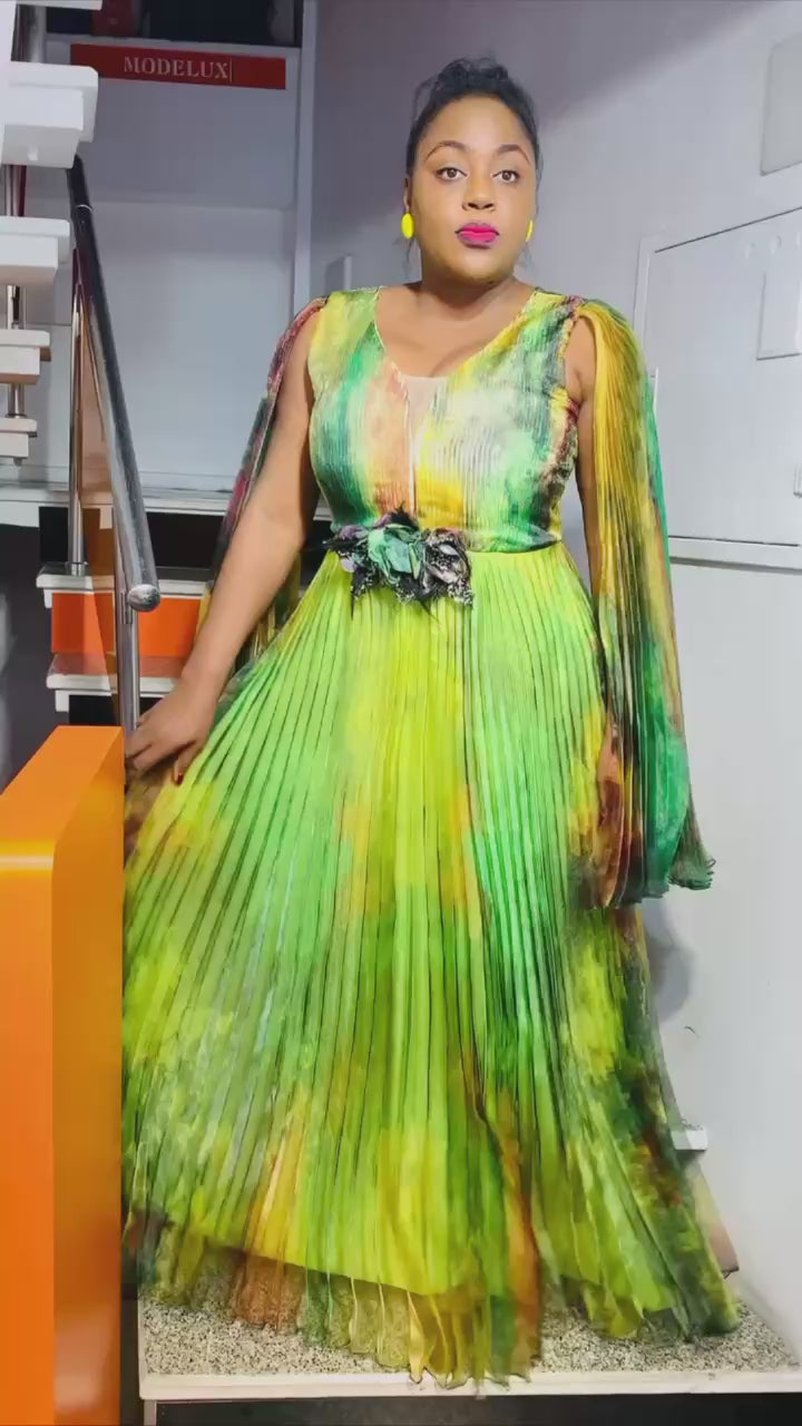 Mutli color Pleated Gown w/Draped Sleeves & Floral Waist Detail