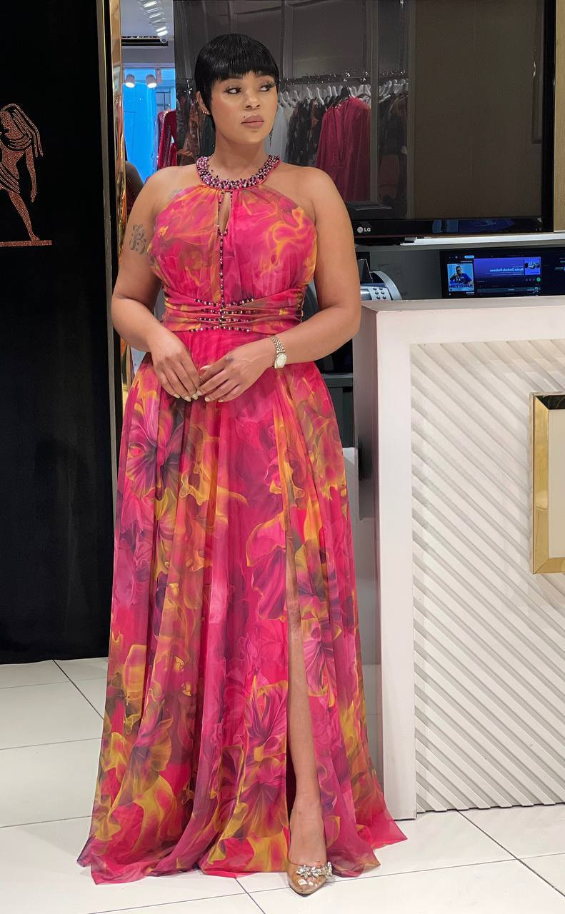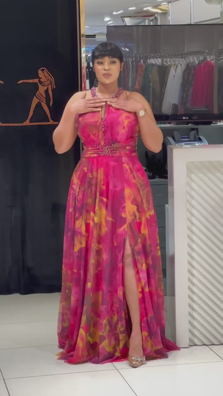 Pink Floral Halter Neck Pleated Maxi Dress w/Crystal Details