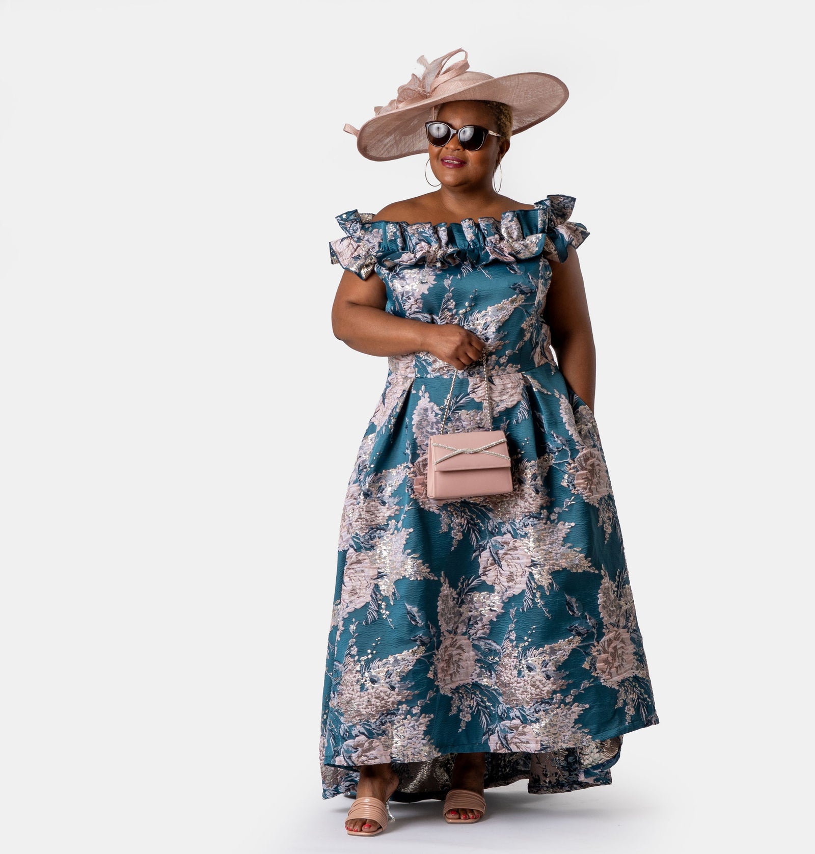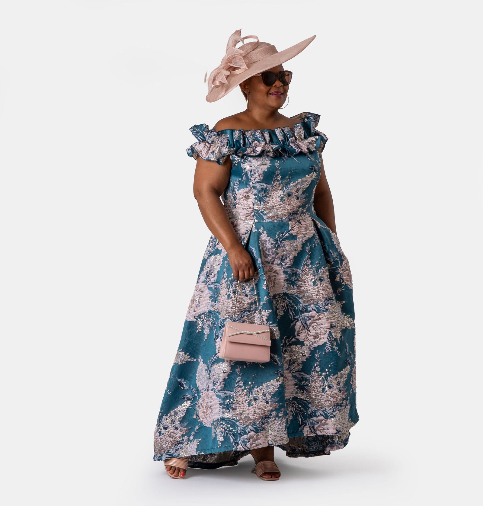 Teal Off-Shoulder Brocade Dress with Ruffle Neckline