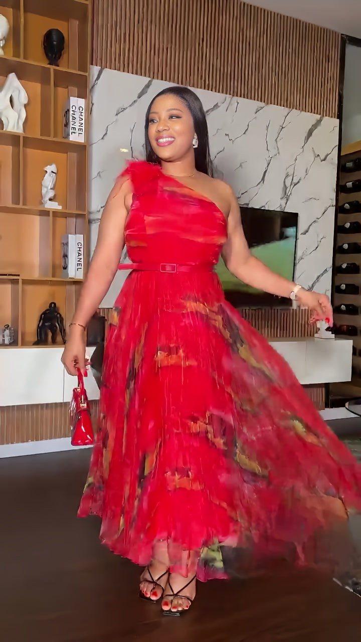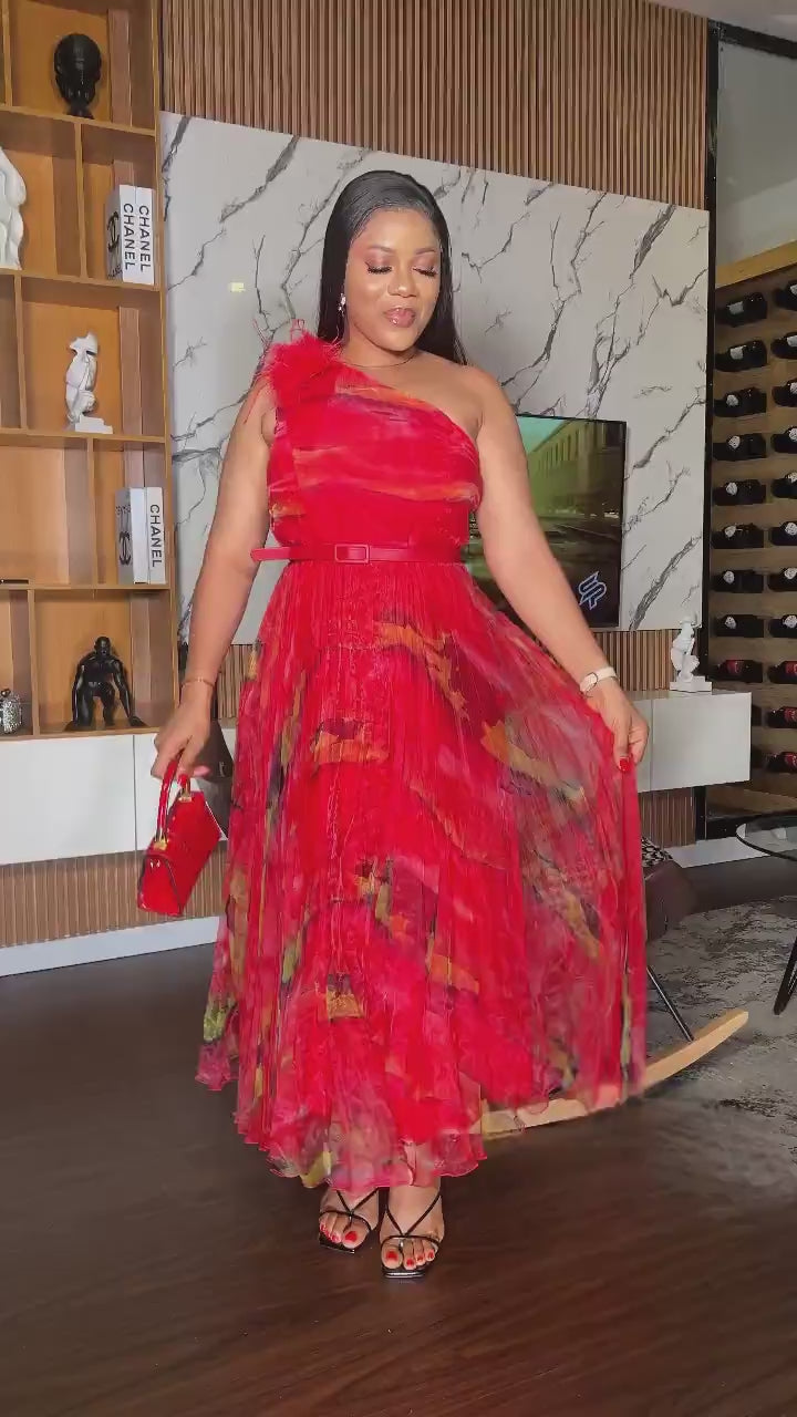 Elegant One-Shoulder Red Pleated Dress with Feather Detail