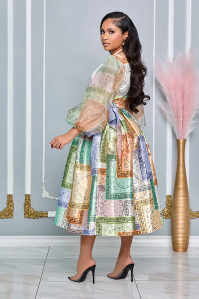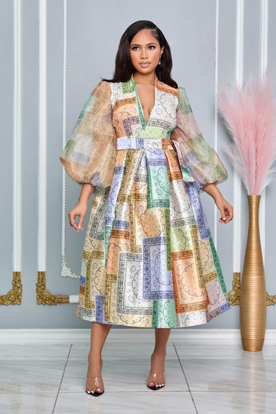 Multi colored Bandana Patch Print Sheer Sleeve Dress
