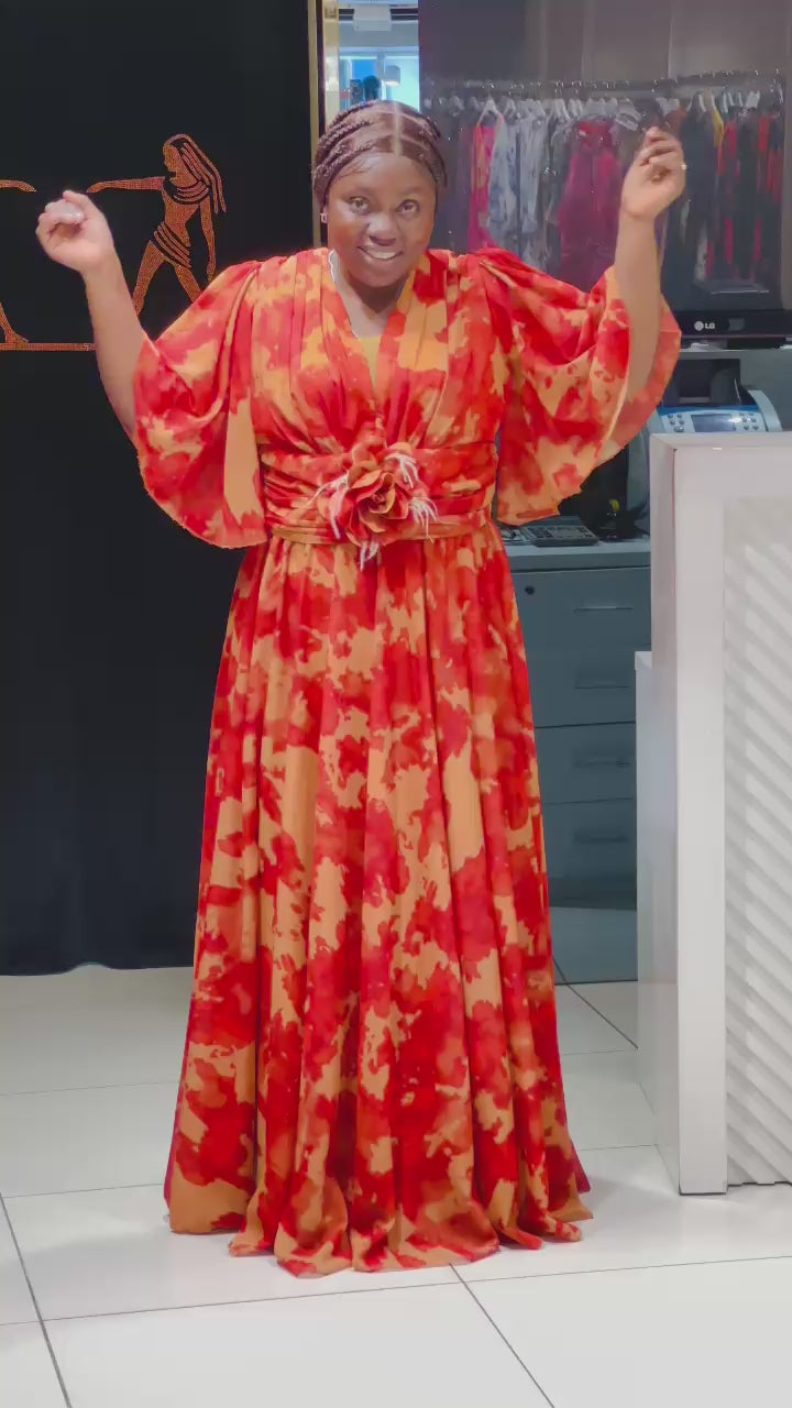 Orange & Yellow Floral Print Kimono Sleeve Maxi Dress with Waist Detail